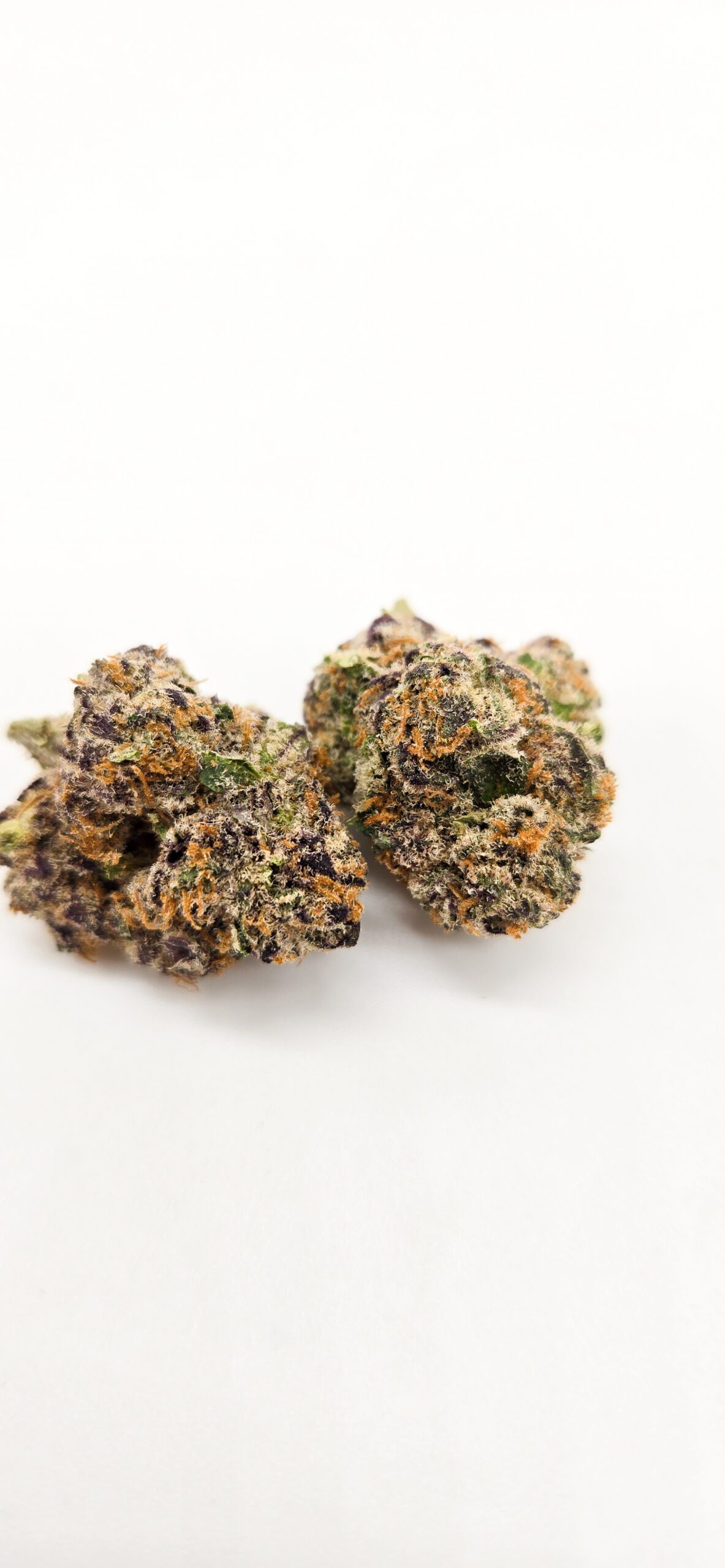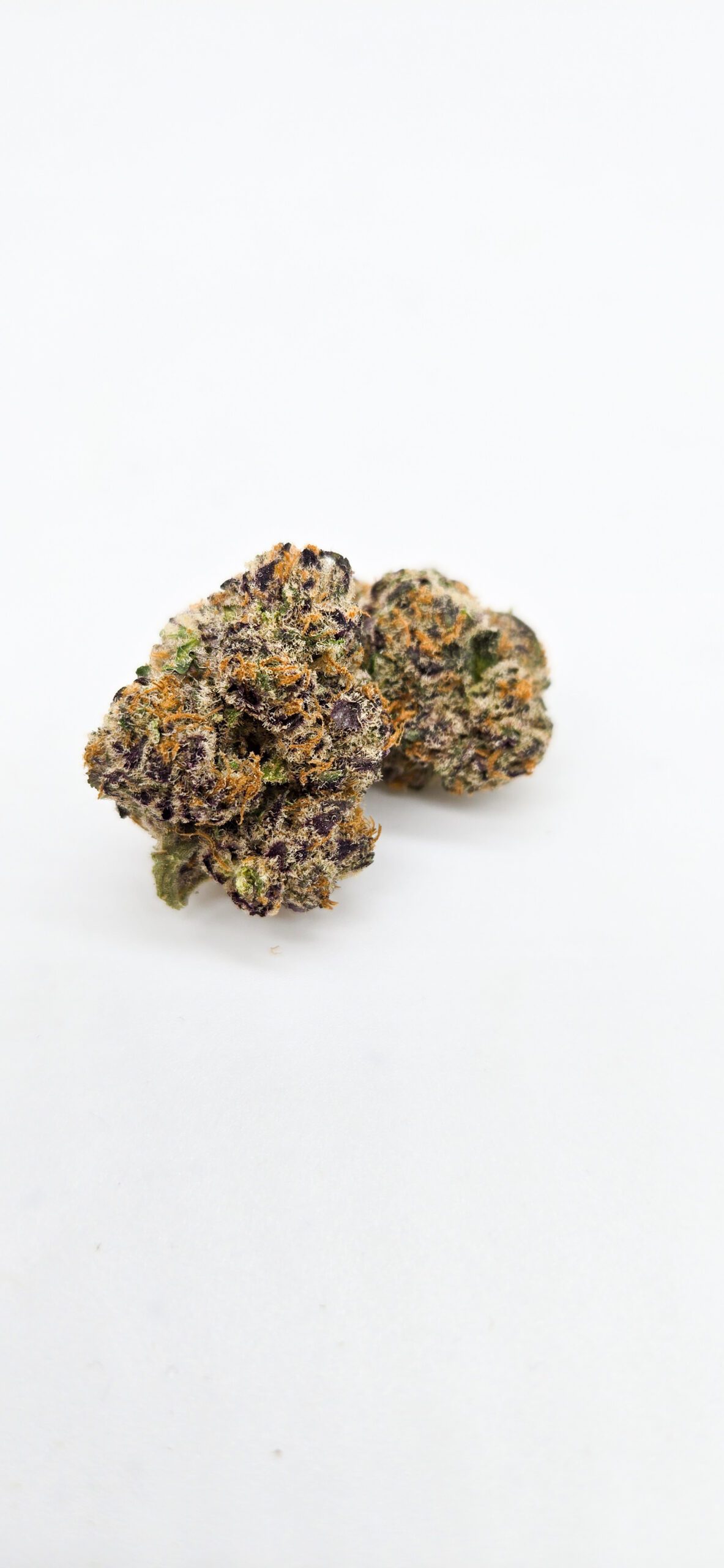 Guava Gelato is coming in at 26.459% THCa and 0.280% Delta 9 THC. Guava Gelato is an indica-leaning phenotype of the classic Gelato strain, known for its rich, dessert-like profile. This release features medium to average-sized nugs with frosty trichomes and subtle purple hues. The aroma is vibrant and layered, offering tropical fruit notes accented by sour pineapple, citrus, and a light touch of fuel.
